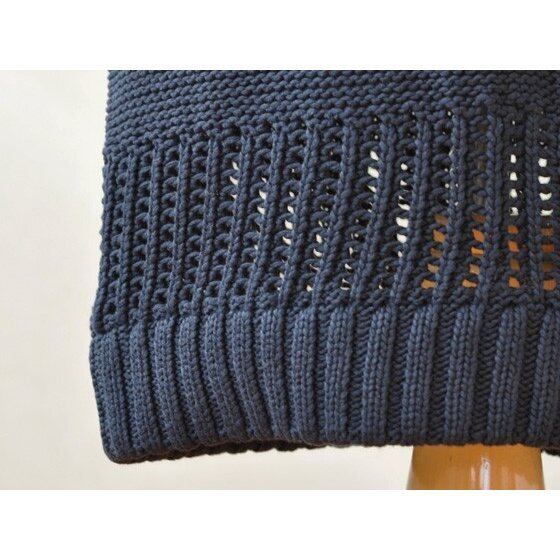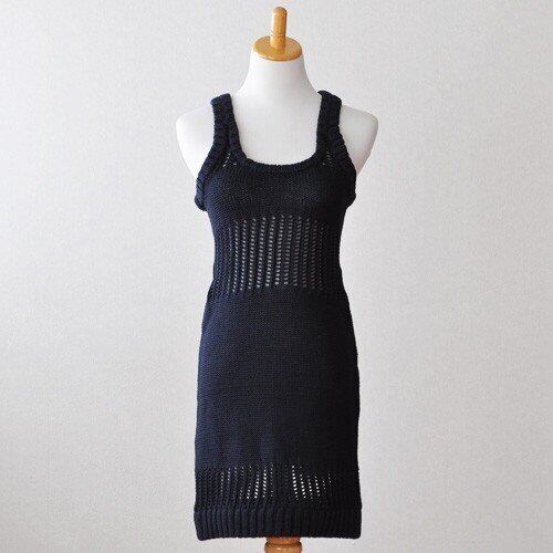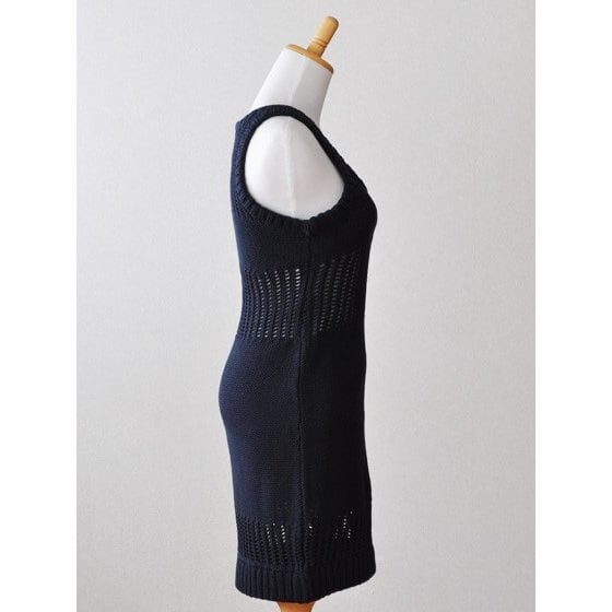 体に沿ってキレイにラインが出る、面白い透かし編みデザインのニットドレス。ネイビーなのでアクセサリーでも遊べます♪